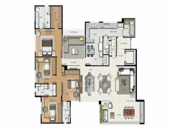 4 quartos com armários e banheiros equipados.